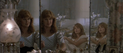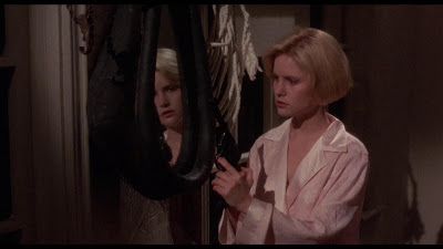 By the late ’80s, Leigh was in her mid-20s and entering a fertile period in her career, one frequently populated with characters plagued by childhood traumas. Mental illness was becoming a recurrent theme in her portrayals. “Troubled” would be the polite term for many of these women, but the less diplomatic “batshit” could certainly describe one or two. JJL’s first disturbed character of note was in Bill Condon’s directorial debut, Sister, Sister, an overheated Southern Gothic thriller in the lapsed Tennessee Williams mode. Here she plays Lucy, the psychically fragile, sheltered younger sister to Judith Ivey in an old-money plantation on the Lousiana Bayou. Lucy suffers from very vivid (and often eroticized) dreams. She claims she sees dead people and is mostly kept under lock and key by Ivey. When a potential suitor enters the picture in the form of Eric Stoltz, sisterly jealousy abounds and those locks tighten further. As it turns out, Ivey may be the real crazy one (not much of a twist), both sisters suffering from a kind of shared PTSD after murdering a local man (Stoltz’s older brother) who tried to molest them as teens.