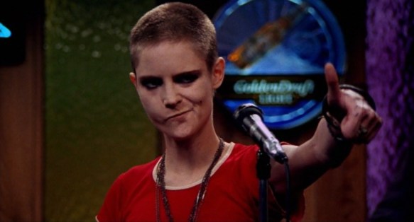 The next year, Leigh tackled a more personal portrayal of addiction in Georgia, a screenplay written by her mother, Barbara Turner, and reportedly influenced by her relationship with her own sister. Here, Leigh plays Sadie Flood, a hard-drinking, drugging and drifting alt-rocker who lives in the shadow of her older, more successful folk singer sister (Mare Winningham). Leigh’s Sadie is all jangly nerves, a vortex of quivering need. She doesn’t have what you’d call natural talent as a singer; the best compliment you could give her is that she is “raw” and persistent. She’s probably not a person you’d want to spend a lot of time with in real life, but Leigh’s unflinching portrayal always keeps you pulling for Sadie. You yearn for her to patch things up with her sister, to pull her life together, to finally hit those high notes. It might be Leigh’s most mannered performance, but it’s also one of her best. Though Georgia (or Leigh) didn’t get nearly the same amount of press, the film could easily be featured on a double bill with Nic Cage’s Academy Award-winning work as an alcoholic screenwriter in Leaving Las Vegas that same year.