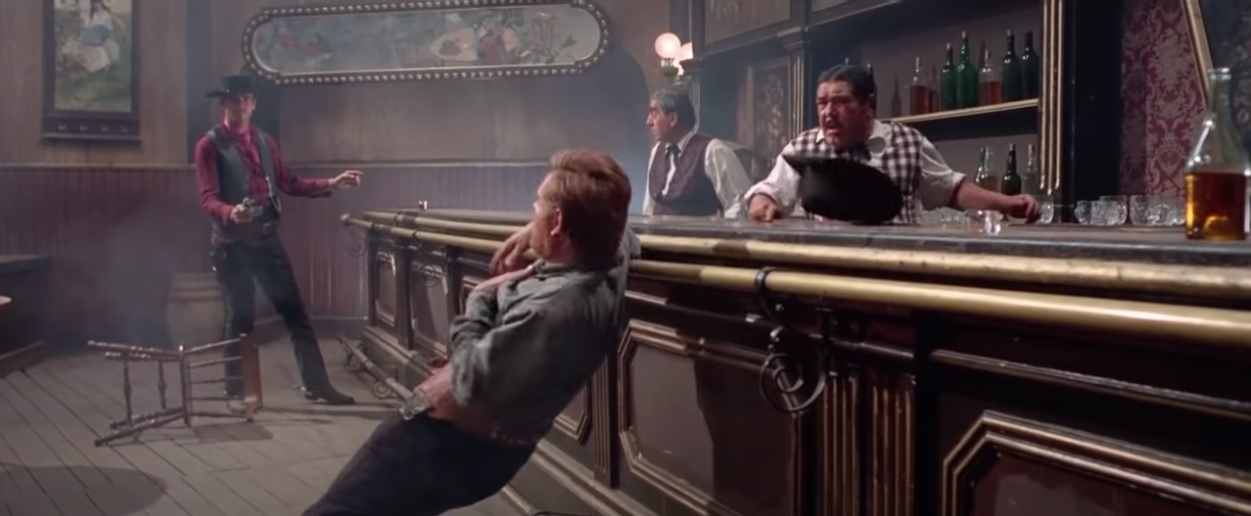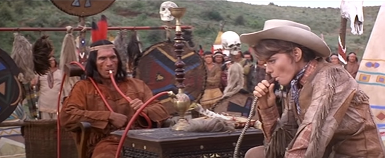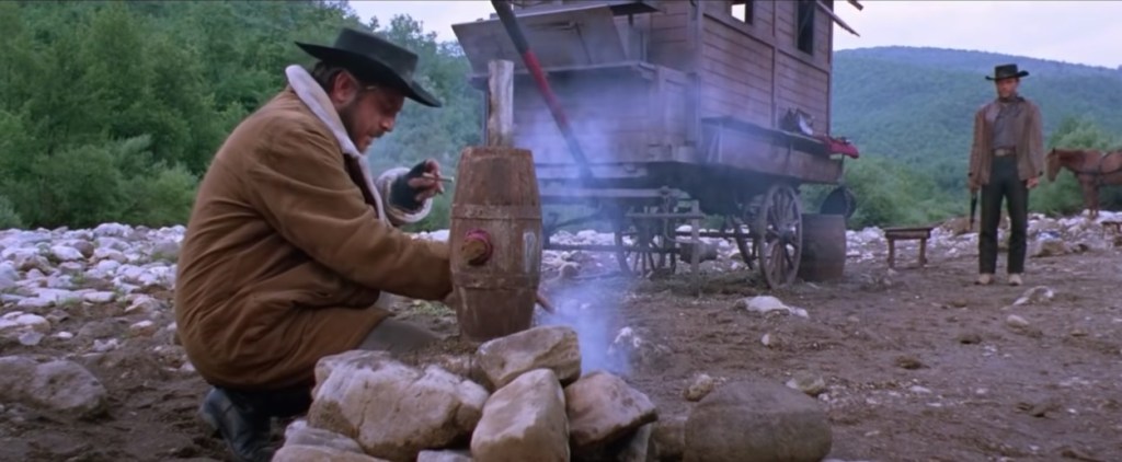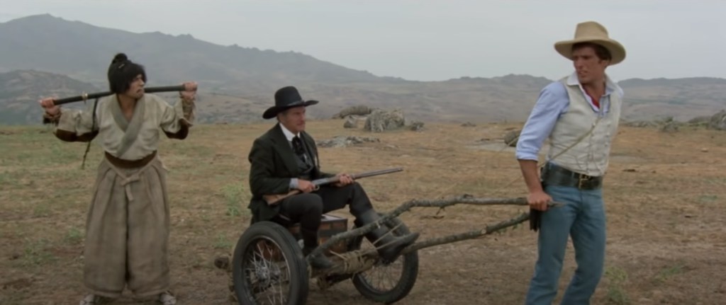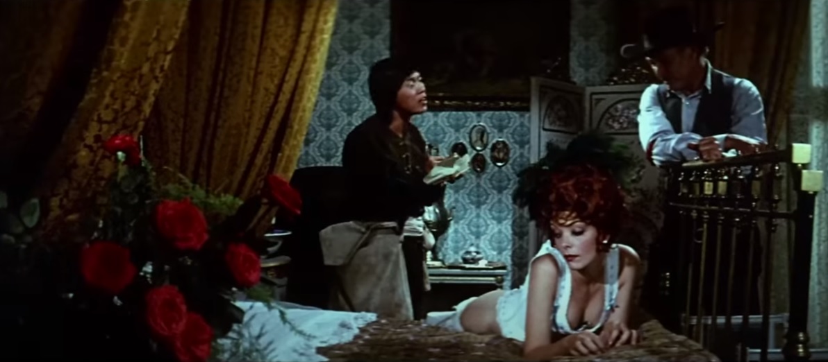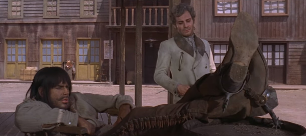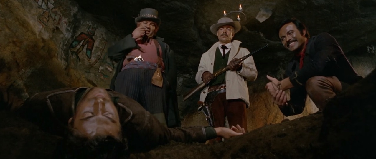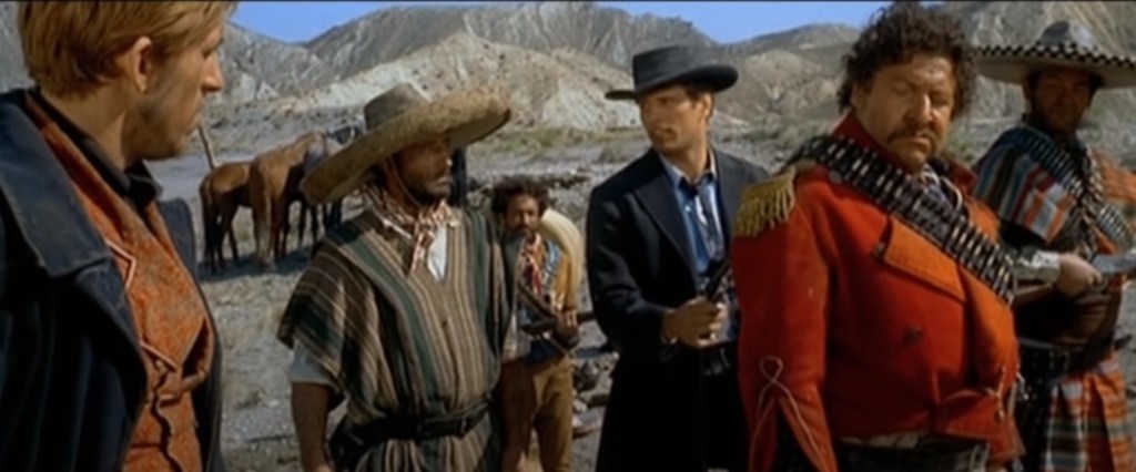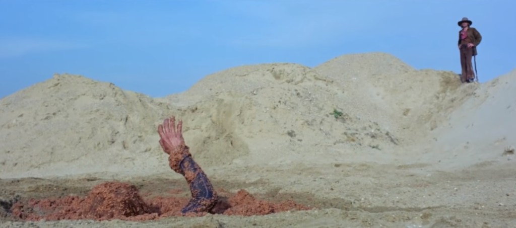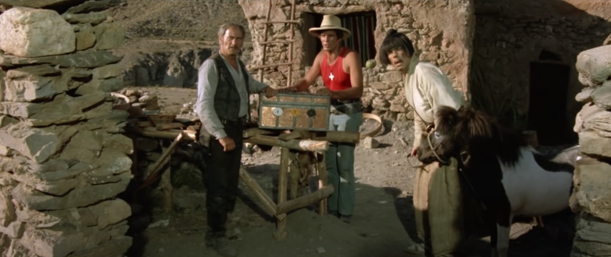 The “other Sergio” brings his illustrious career in westerns (and this blog entry) to a close with a mildly amusing and EXTREMELY DATED genre-spanning parody of Red Sun, Leone’s classic westerns, and the original samurai flicks that spawned the spaghetti boom, with copious verbal and visual nods to his own filmography along the way. When a prized miniature Japanese horse intended as a gift to the U.S. President is supposedly stolen from a train by a band of Apache, an unlucky Sheriff Gideon (Eli Wallach), a resourceful thief named “Swiss” (Giuliano Gemma), and the shamed manservant Sakura (Tomas Milian) charged with scooping its royal droppings must team up to transport a trunk containing the million-dollar ransom to the tribe. To make things more complicated, the trunk is equipped with three color-coded locks (white, yellow, black), one that will open the trunk and another that will detonate the load of dynamite inside. Speaking of which, TRIGGER WARNING: Milian is basically channeling Mickey Rooney’s “yellowface” performance in Breakfast at Tiffany’s here, muttering in made-up Japanese and constantly threatening to commit hari kari. In other words, extremely sensitive viewers should avoid this one at all costs…or at least view it within the context of the decade it was made. I doubt Kurosawa would’ve approved, though he might’ve chuckled here and there, since this movie is essentially Corbucci’s playful open admission that an entire decade of spaghetti was based on a simple act of horse thievery, that of Leone’s original co-opting of Yojimbo back in 1964.