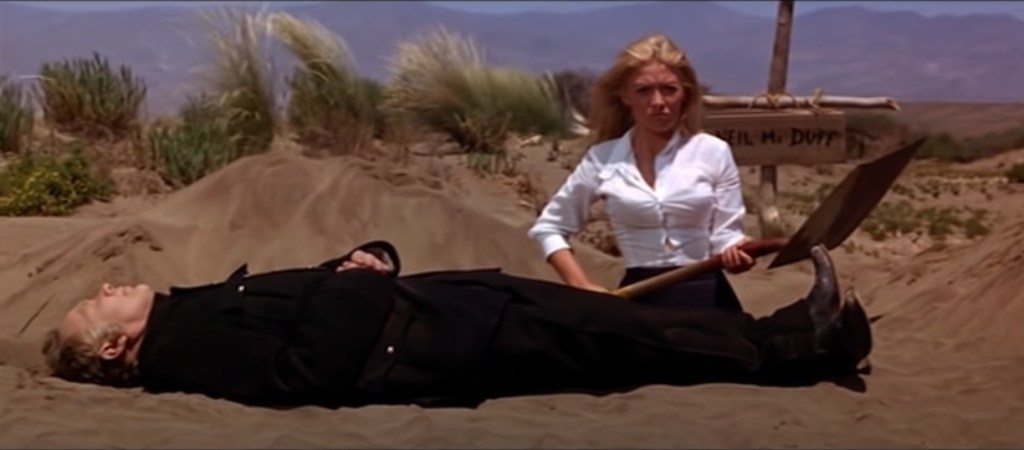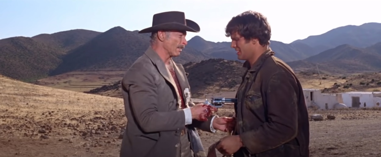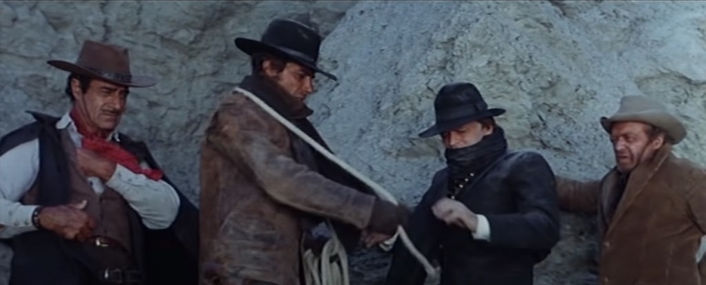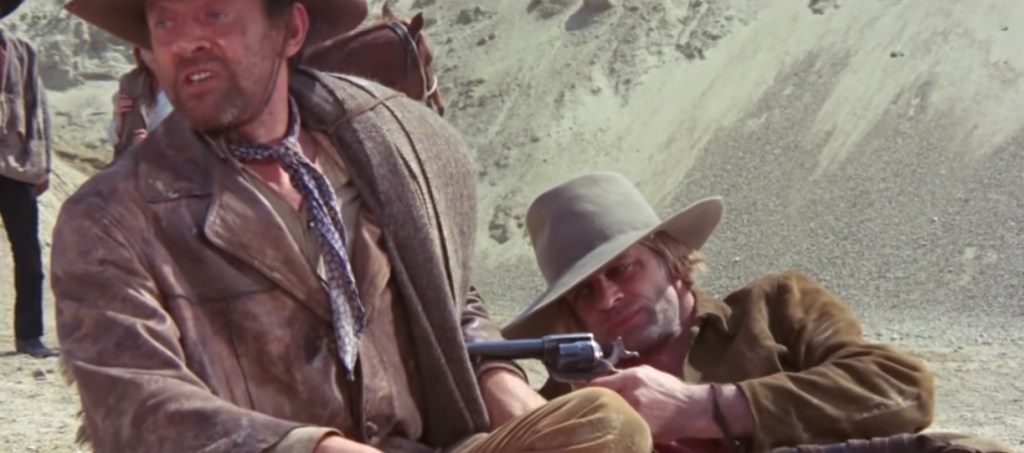 Giuliano Gemma, on loan from the first two Ringo movies, stars as trickster gunfighter Arizona Colt, so named because he happens to be in Arizona at the time and carries the titular sidearm. After being accidentally freed in a prison raid by the swarthy, portly bandit Gordo (an enjoyable Fernando Sancho), Arizona demurs on Gordo’s offer to join his gang of Sidewinders (branded with a “S” in their flesh) and instead spends the rest of the movie being a saddle sore in Gordo’s ass, foiling his various robbery schemes and gold-heisting attempts. One standout scene involves Arizona arranging the bodies of Gordo’s dead henchmen to spell out the word “NO” in answer to his ongoing recruitment tactics. It seems Arizona prefers the company of a lively comic-relief drunkard named Double Whiskey (Roberto Camardiel), a good thing since his love interest Jane (Corinne Marchard) is kind of a WASP-y bore. There are a few fun, though recognizable, lifts from Leone’s Dollars trilogy, including a very long-barreled pistol, a musical watch, and a gag involving fake arms in a jacket used to obscure a hidden pistol. The final gun battle between Arizona and Gordo amid numerous caskets in the undertaker’s quarters gets the job done.