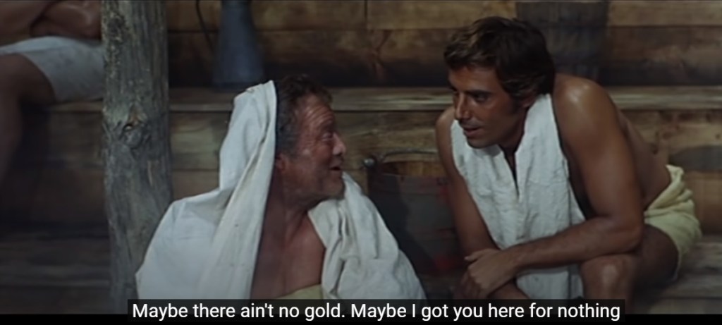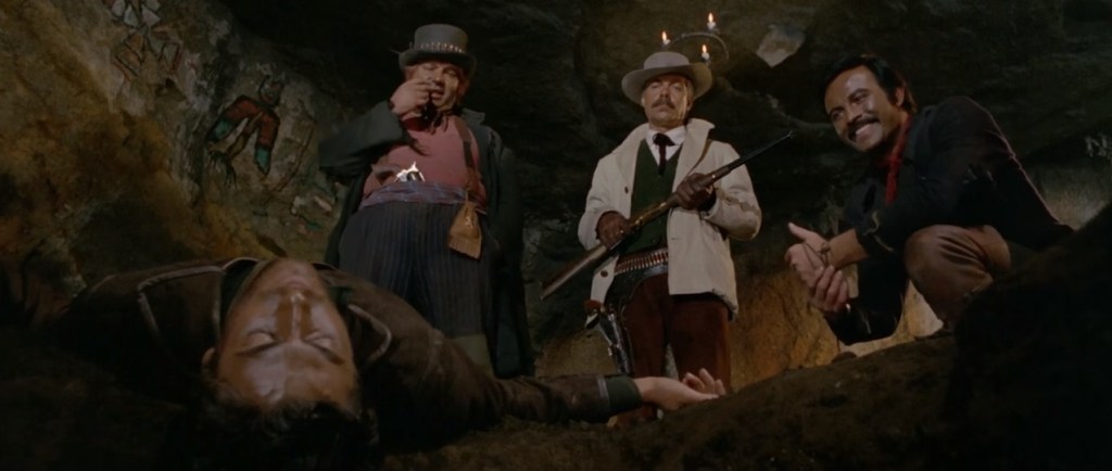 One of the few Italian westerns I’ve seen to prioritize the intricacies of gold prospecting over gunfighting and maybe the only one to feature its dirty main characters steaming in a sauna instead of a lukewarm cathouse washtub. Noted hard-drinker Van Heflin plays an old paranoid prospector, Cooper, who happily takes on a young trusted protégé (George Hilton), then far more reluctantly two additional partners (Klaus Kinski and Gilbert Roland) to help dig out the cache of shiny nuggets he found in a distant cave. Naturally, distrust and paranoia abounds along the way, as do numerous double-crosses. A tight little heist thriller wrapped in western duds. Think Treasure of the Sierra Madre but with more bullets flying, or Reservoir Dogs with fewer f-bombs, set in an abundant mine instead of an abandoned warehouse.