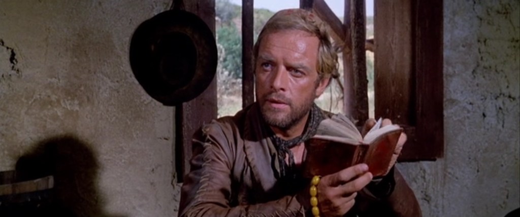 Perhaps the first and only spaghetti western to open with a peace treaty scene, one which inevitably turns into a Mexican peasant massacre under the diabolical schemes of renegade Confederate Fergusson (Mark Damon). Lou Castel, playing the polar opposite of his white devil role in A Bullet for the General, stars as a pacifist, half-Mexican gunman, Jeremy, who escaped the massacre as a child and was taken in by a religious white family. He grows up to become a seeker of justice and of his half-sister Princy who was abducted by the foul Fergusson’s henchman. Jeremy soon adopts the nickname “Requiescant” for his habit of spouting Latin Biblical phrases (“Let them rest in peace”) after inadvertently or purposely gunning someone down. He also has a bad habit of spurring his horse onward by banging a frying pan on its butt repeatedly, not the most saintly of riding techniques. Requiescant is an offbeat Italian attempt to expunge (and wallow in) the sins of the Old West with a peculiarly contradictory character at its center. It’s a little slow and borderline pretentious in spots, but at least there’s a creative noose-bound saloon showdown, deaths by church bell, and noted heathen auteur Pier Paolo Pasolini (of Salo fame) running around in a priest’s frock to keep things interesting.